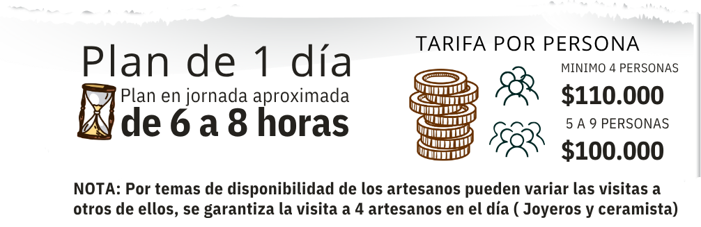 Plan de visita a Artesanos del Municipio de TINJACÁ: Saliendo desde la población de Tinjacá, por un bonito camino rural, tendremos la agradable visita a la Fábrica de productos alimenticios de El Robledal, productos ya reconocidos por su calidad en la región y el país. Allí podremos observar algunos de los procesos de elaboración de los productos. Visitaremos El taller de ESPARTO, productos artesanales y artísticos elaborados por manos campesinas que combinan técnicas ancestrales, con fibras naturales y maderas de calidad.